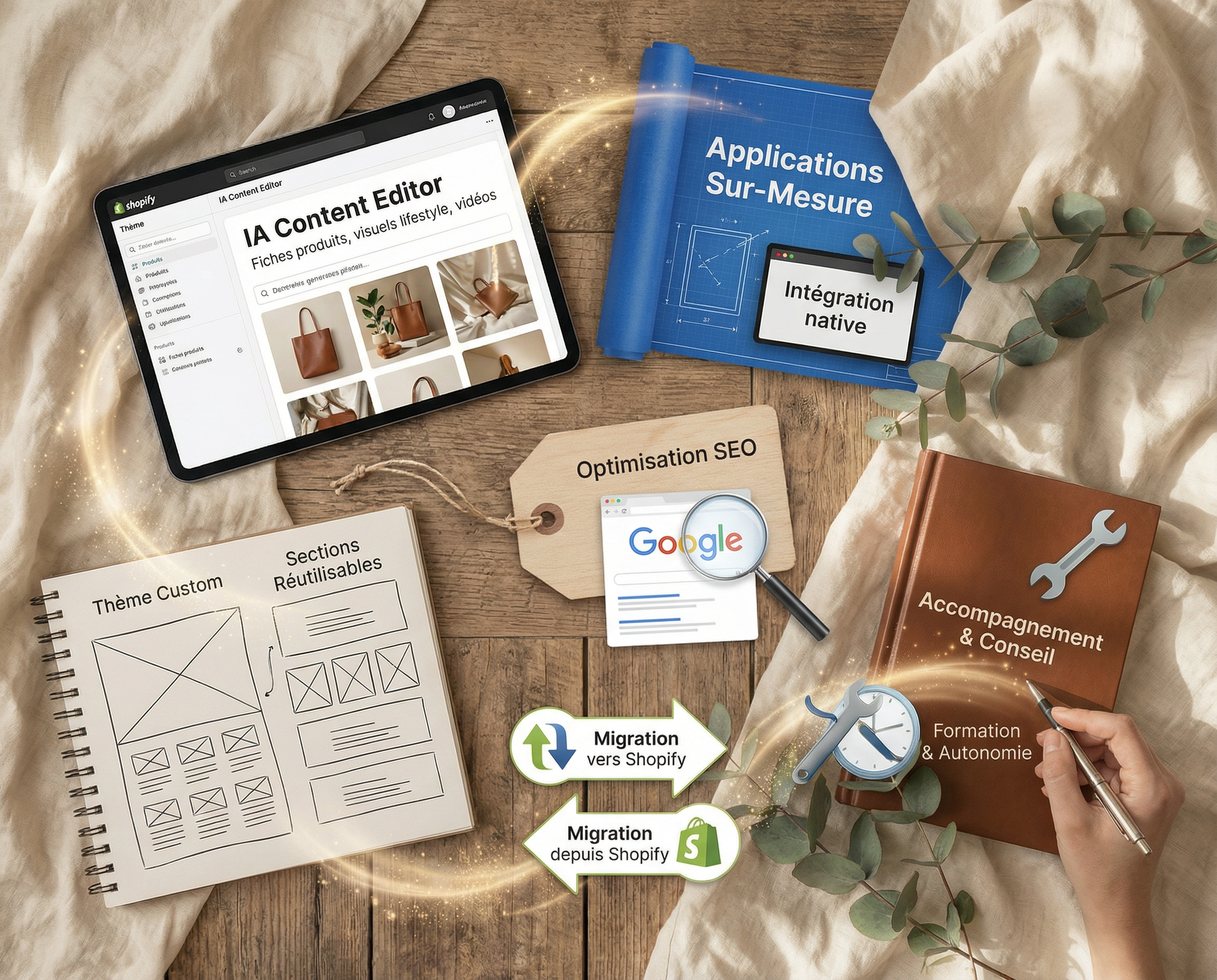 Thèmes & sections sur-mesure — Thème custom complet ou adaptation d’un thème existant, création de sections réutilisables pour l’éditeur natif Shopify — votre boutique ressemble à votre marque, pas à un template vu mille fois. Chaque composant est optimisé pour la vitesse et le mobile.